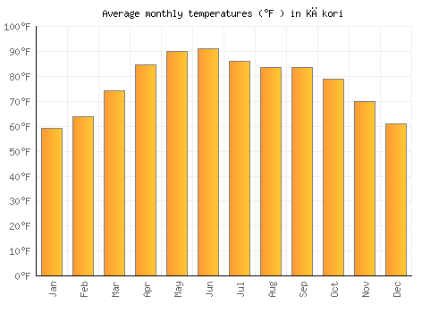 | Max °F | 59.4 | 64 | 74.5 | 84.9 | 90.3 | 91.2 | 86 | 83.8 | 83.5 | 79 | 70 | 61.2 |