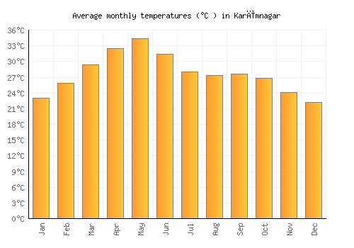The bar chart below shows the average monthly peak daytime temperatures at Karīmnagar