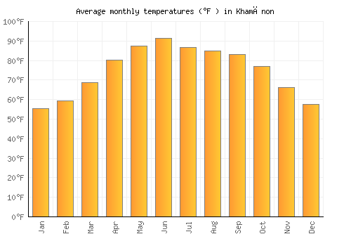 The bar chart below shows the average monthly peak daytime temperatures at Khamānon