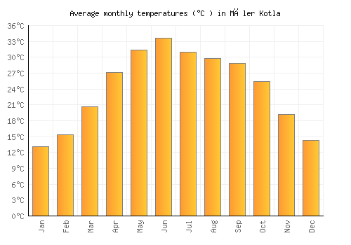 The bar chart below shows the average monthly peak daytime temperatures at Māler Kotla