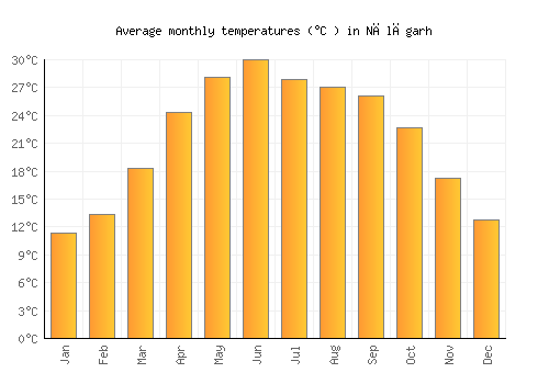 The bar chart below shows the average monthly peak daytime temperatures at Nālāgarh