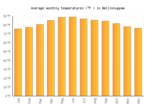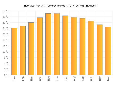 The bar chart below shows the average monthly peak daytime temperatures at Nellikkuppam