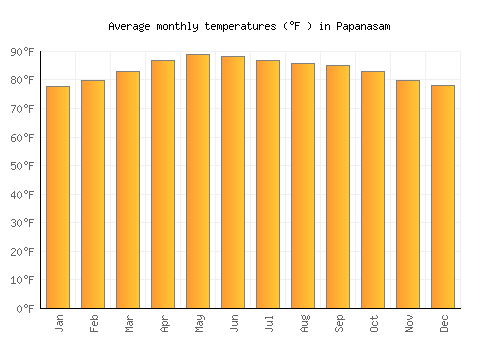 The bar chart below shows the average monthly peak daytime temperatures at Papanasam
