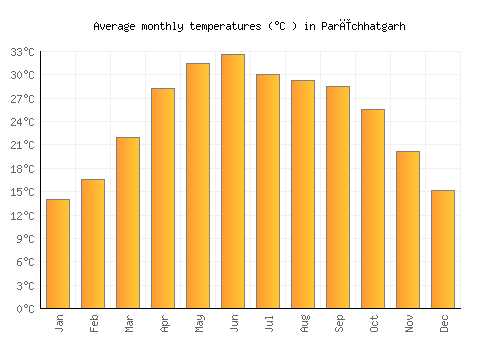 The bar chart below shows the average monthly peak daytime temperatures at Parīchhatgarh