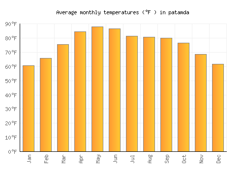 The bar chart below shows the average monthly peak daytime temperatures at patamda