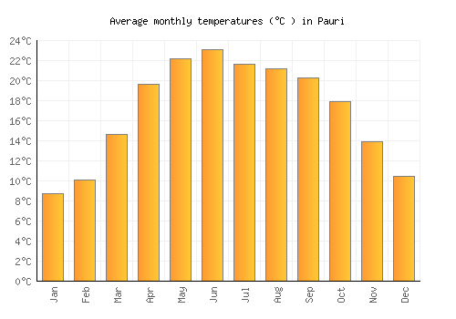 The bar chart below shows the average monthly peak daytime temperatures at Pauri