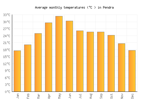 The bar chart below shows the average monthly peak daytime temperatures at Pendra