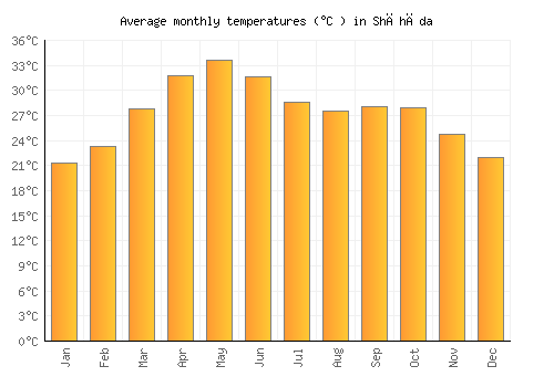The bar chart below shows the average monthly peak daytime temperatures at Shāhāda