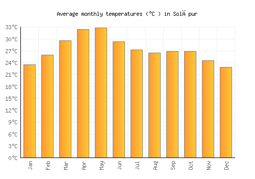 The bar chart below shows the average monthly peak daytime temperatures at Solāpur