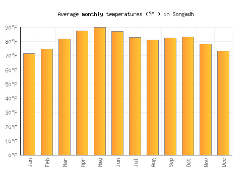 | Max °F | 71.4 | 74.7 | 81.9 | 87.6 | 90 | 87.3 | 82.9 | 81.3 | 82.4 | 83.3 | 78.3 | 73.2 |