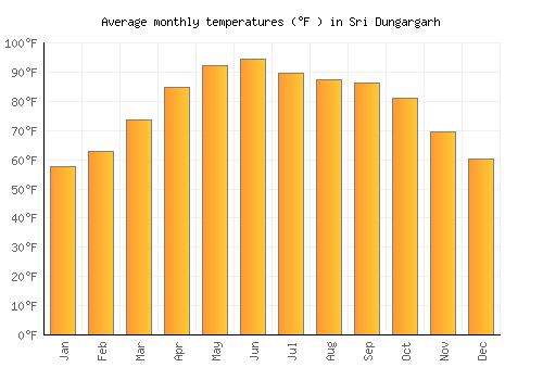 The bar chart below shows the average monthly peak daytime temperatures at Sri Dungargarh