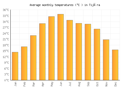 The bar chart below shows the average monthly peak daytime temperatures at Tijāra
