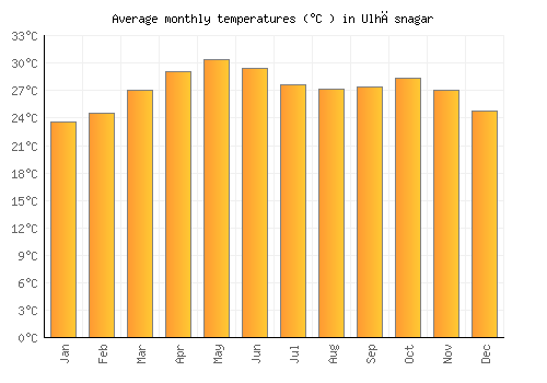 The bar chart below shows the average monthly peak daytime temperatures at Ulhāsnagar