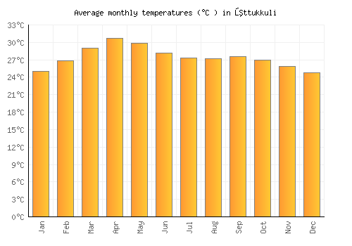 The bar chart below shows the average monthly peak daytime temperatures at Ūttukkuli
