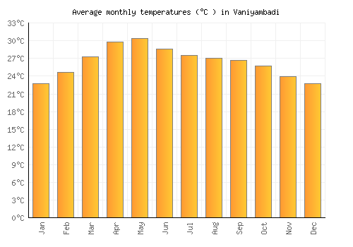 The bar chart below shows the average monthly peak daytime temperatures at Vaniyambadi