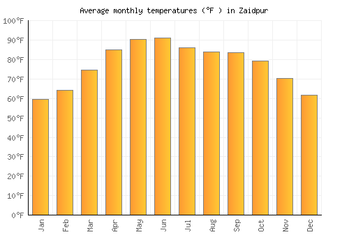 The bar chart below shows the average monthly peak daytime temperatures at Zaidpur