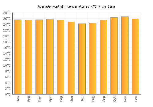 The bar chart below shows the average monthly peak daytime temperatures at Bima
