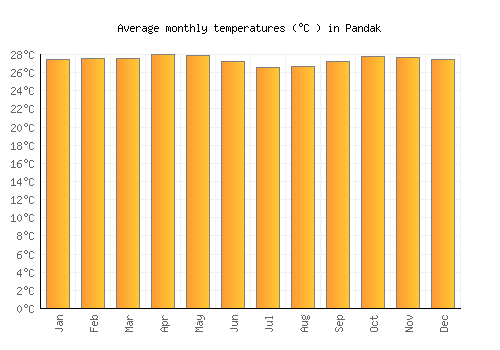 The bar chart below shows the average monthly peak daytime temperatures at Pandak