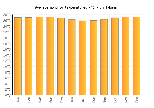 The bar chart below shows the average monthly peak daytime temperatures at Tabanan
