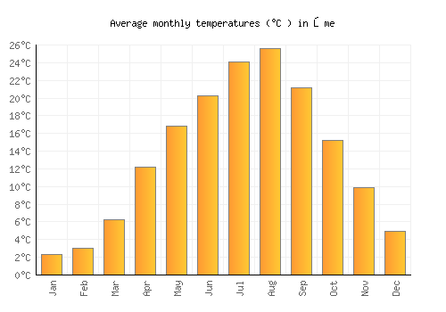 The bar chart below shows the average monthly peak daytime temperatures at Ōme