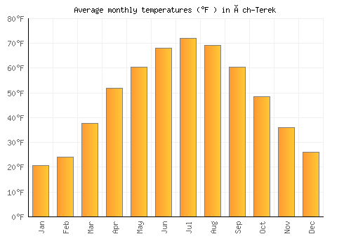 The bar chart below shows the average monthly peak daytime temperatures at Üch-Terek