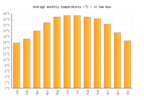 The bar chart below shows the average monthly peak daytime temperatures at Xam Nua