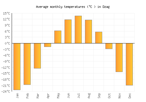 The bar chart below shows the average monthly peak daytime temperatures at Dzag