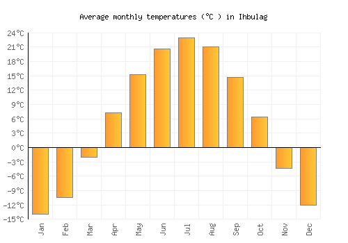 The bar chart below shows the average monthly peak daytime temperatures at Ihbulag