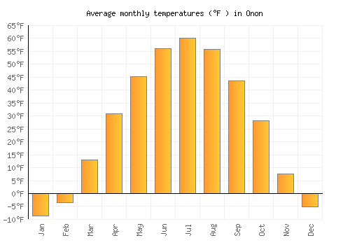 The bar chart below shows the average monthly peak daytime temperatures at Onon