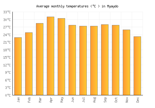 The bar chart below shows the average monthly peak daytime temperatures at Myaydo