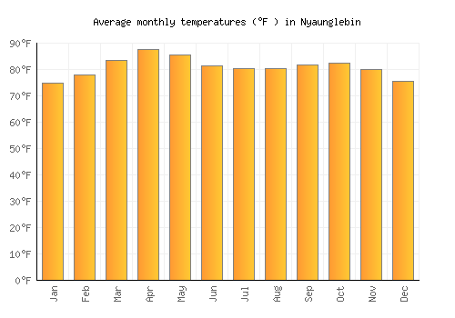 The bar chart below shows the average monthly peak daytime temperatures at Nyaunglebin