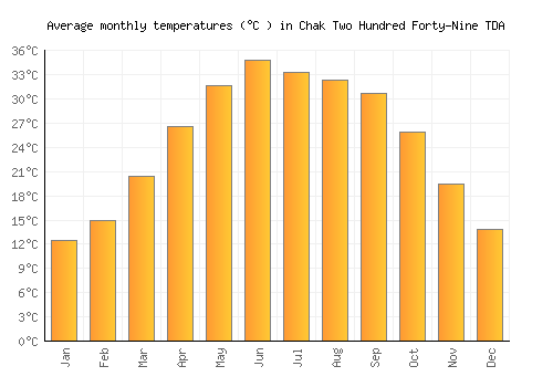 The bar chart below shows the average monthly peak daytime temperatures at Chak Two Hundred Forty-Nine TDA