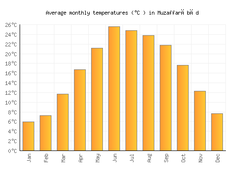The bar chart below shows the average monthly peak daytime temperatures at Muzaffarābād
