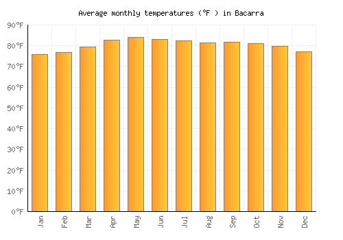 The bar chart below shows the average monthly peak daytime temperatures at Bacarra