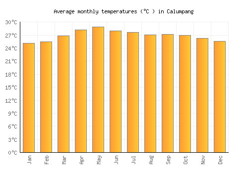 The bar chart below shows the average monthly peak daytime temperatures at Calumpang