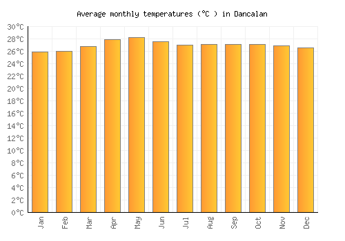 The bar chart below shows the average monthly peak daytime temperatures at Dancalan