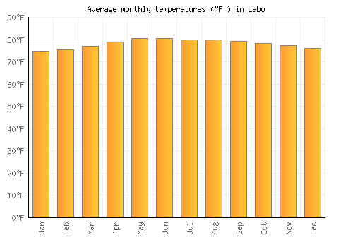 | Max °F | 75 | 75.6 | 77 | 79 | 80.6 | 80.6 | 79.9 | 80.1 | 79.3 | 78.4 | 77.5 | 76.1 |