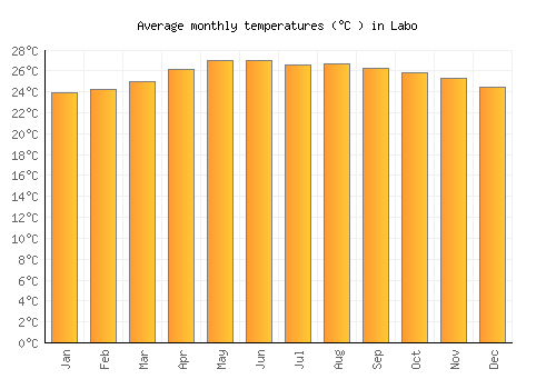The bar chart below shows the average monthly peak daytime temperatures at Labo