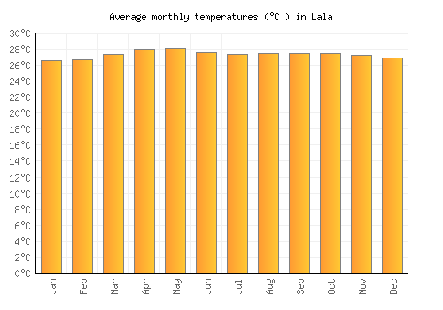 Average annual rainfall in Lala: 2470.367mm (972.6 inches)