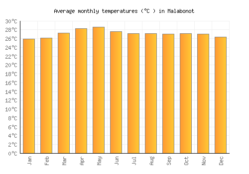 The bar chart below shows the average monthly peak daytime temperatures at Malabonot