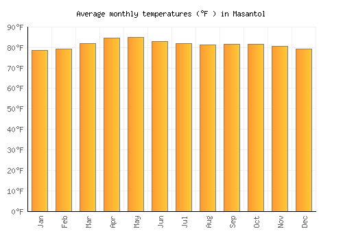 The bar chart below shows the average monthly peak daytime temperatures at Masantol