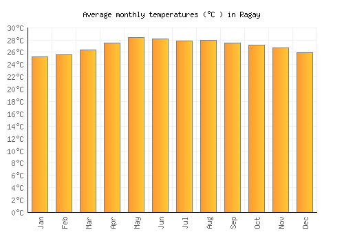 The bar chart below shows the average monthly peak daytime temperatures at Ragay