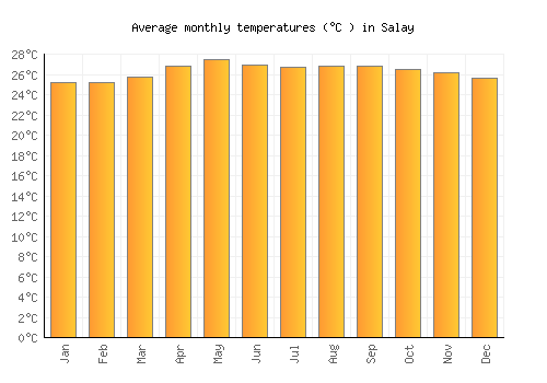 The bar chart below shows the average monthly peak daytime temperatures at Salay