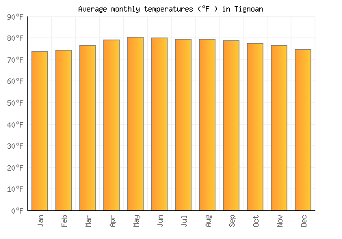 | Max °F | 73.8 | 74.5 | 76.6 | 79 | 80.4 | 80.1 | 79.3 | 79.3 | 78.8 | 77.7 | 76.6 | 74.8 |