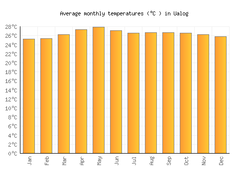 The bar chart below shows the average monthly peak daytime temperatures at Ualog