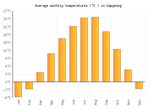 The bar chart below shows the average monthly peak daytime temperatures at Gapyeong