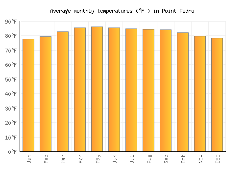 The bar chart below shows the average monthly peak daytime temperatures at Point Pedro