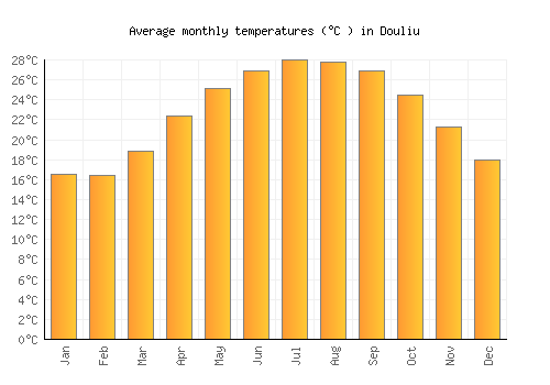The bar chart below shows the average monthly peak daytime temperatures at Douliu