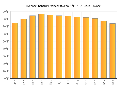 | Max °F | 74.8 | 80.1 | 84.4 | 86.9 | 85.6 | 84.6 | 83.8 | 82.9 | 82.2 | 80.8 | 77.4 | 73.9 |
