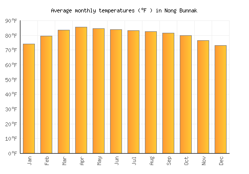 | Max °F | 74.3 | 79.7 | 83.5 | 85.6 | 84.7 | 84 | 83.3 | 82.6 | 81.7 | 79.9 | 76.5 | 73 |